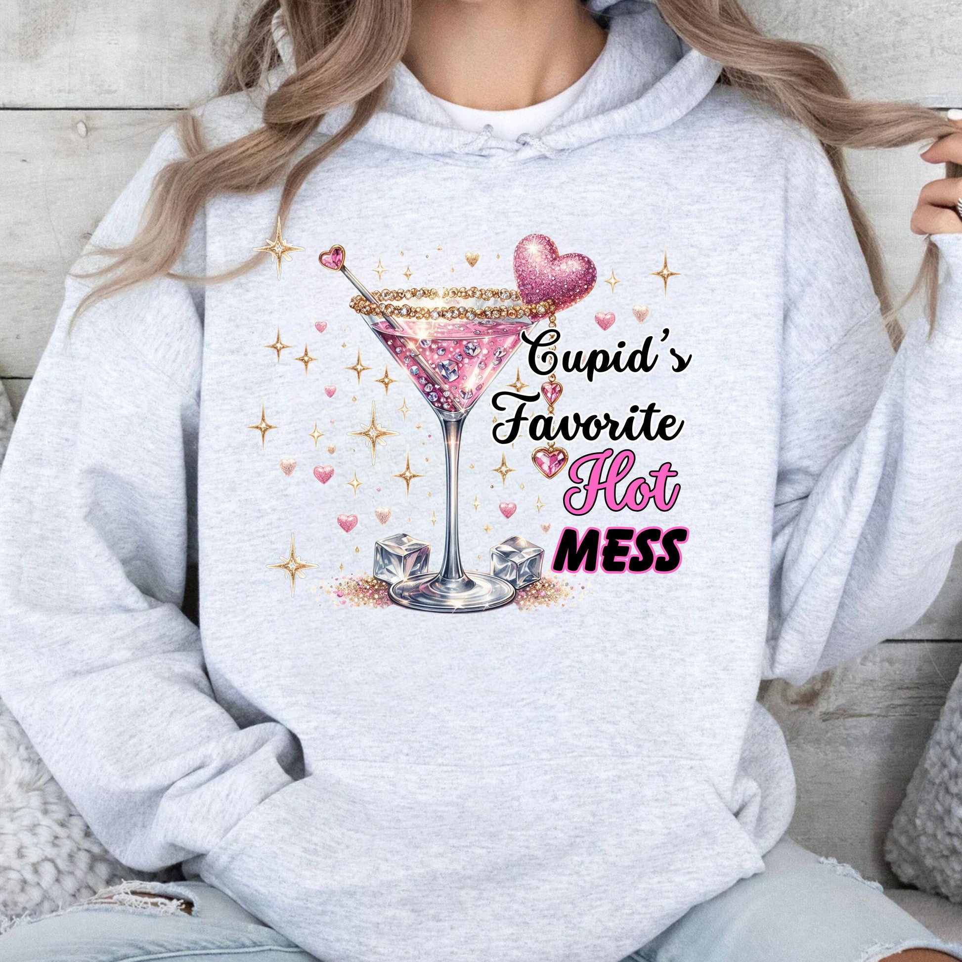 This Cupid's Favorite Hot Mess Valentines Day Pullover Hoodie is perfect for celebrating the holiday while keeping cozy. With a catchy phrase and comfortable hoodie design, it's a fun and stylish option for anyone looking to spread some Valentine's Day cheer.